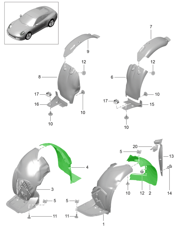 OEM 品质的硬件套件包括螺丝、夹子和支架,用于安全、无振动地安装保时捷拱门衬里和盖子。