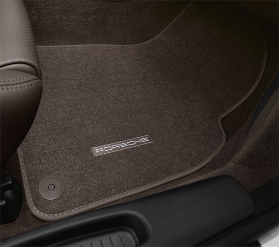 Made-to-measure floor mats with nubuck edging and "PORSCHE" logo, which have a waterproof underside and are non-slip. They are secured by a special fastener system.