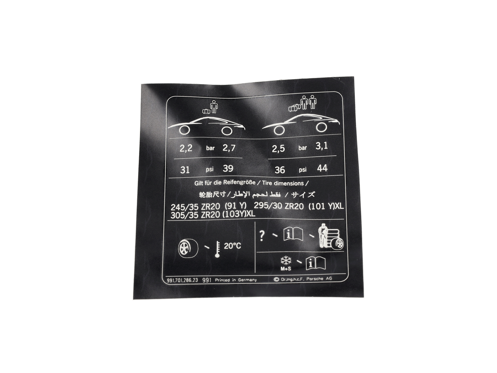 轮胎贴花是保时捷车辆上必不可少的识别和信息标签,用于显示建议的轮胎胎压、尺寸和规格。这些贴花在确保正确的轮胎保养和性能方面发挥着重要作用,同时还能展现保时捷内饰、行李箱或车门框的真实质感。无论是修复经典车型还是维护现代车型,清晰准确的轮胎贴花都兼具实用性和视觉效果。