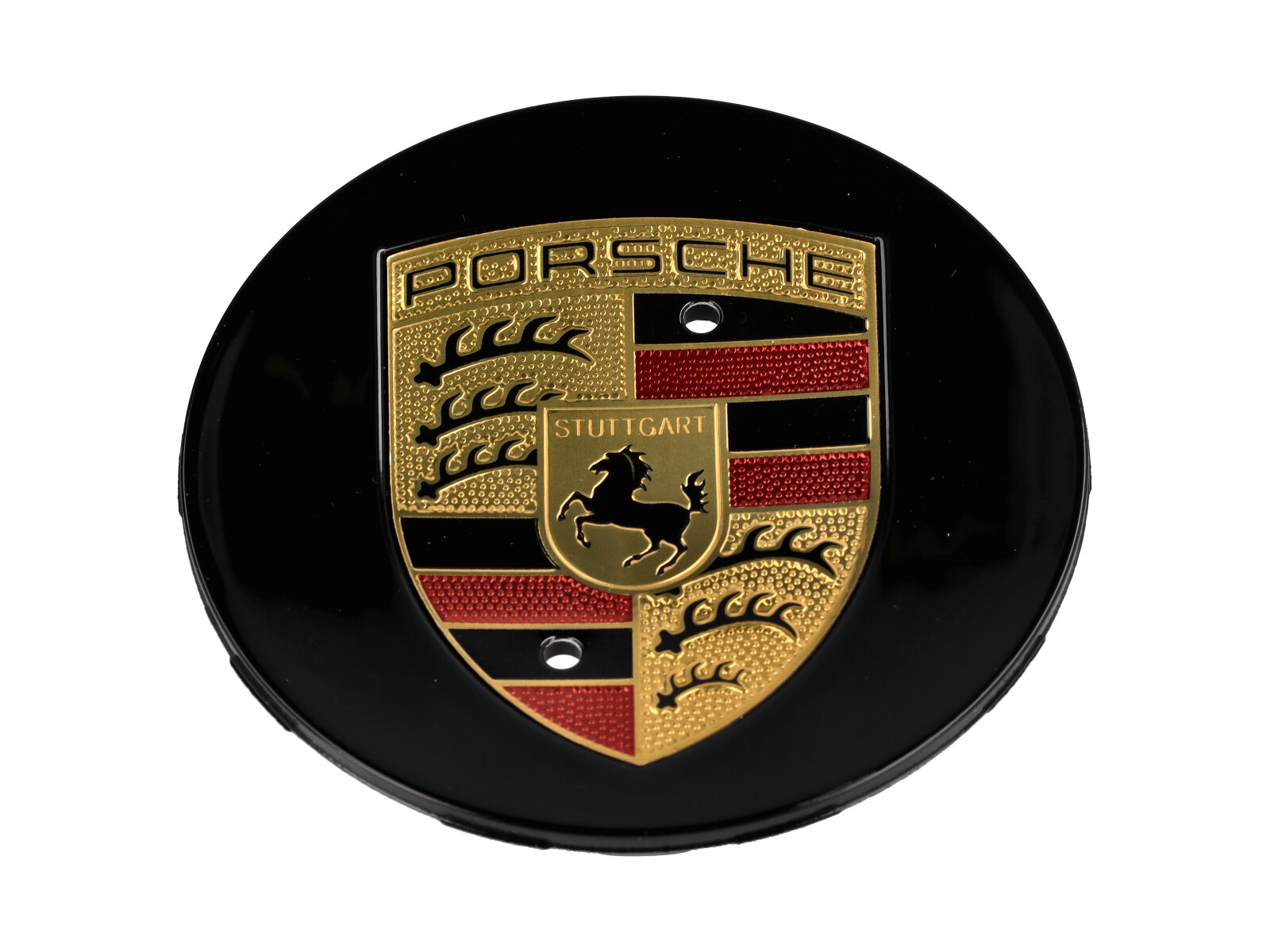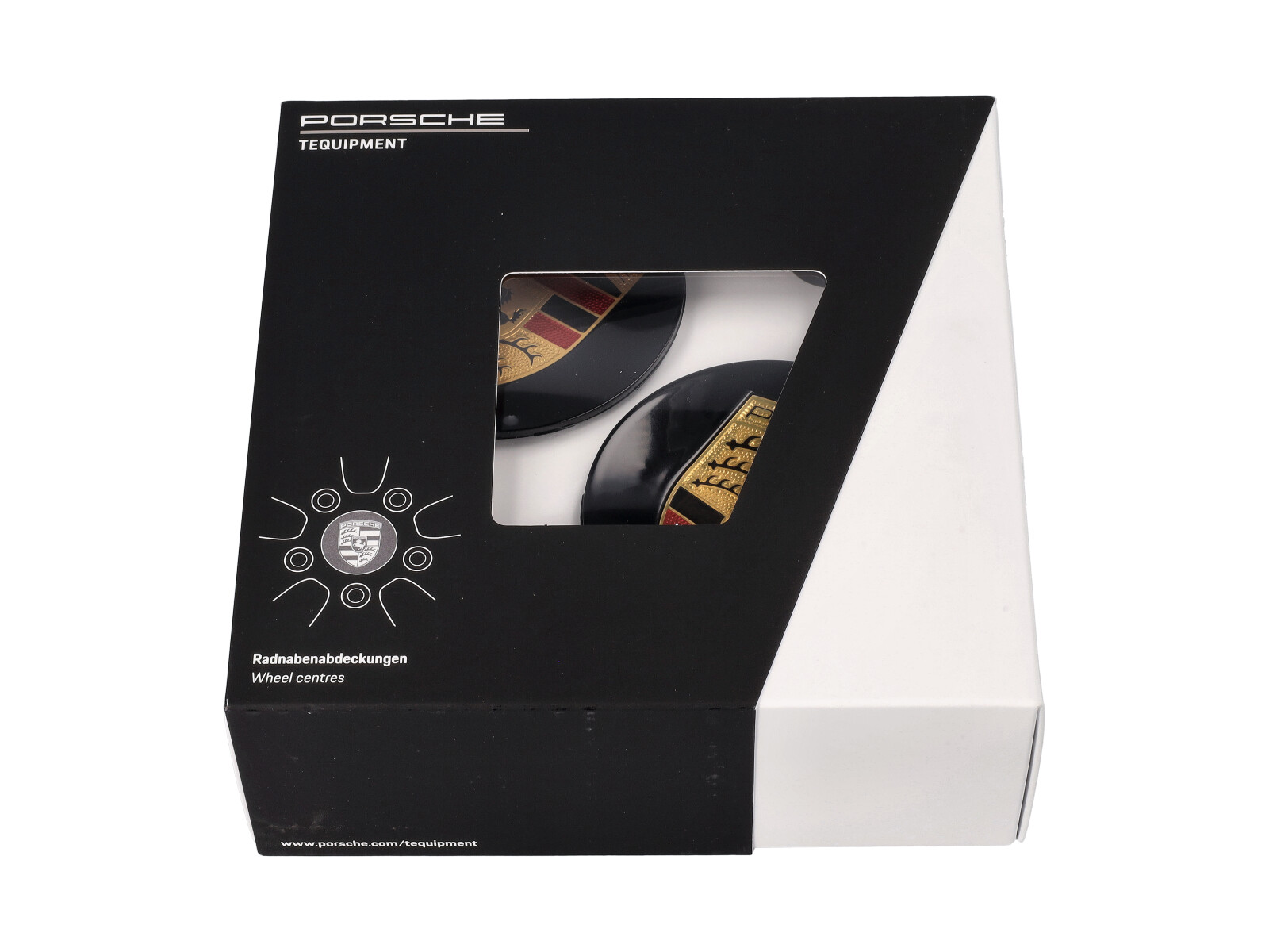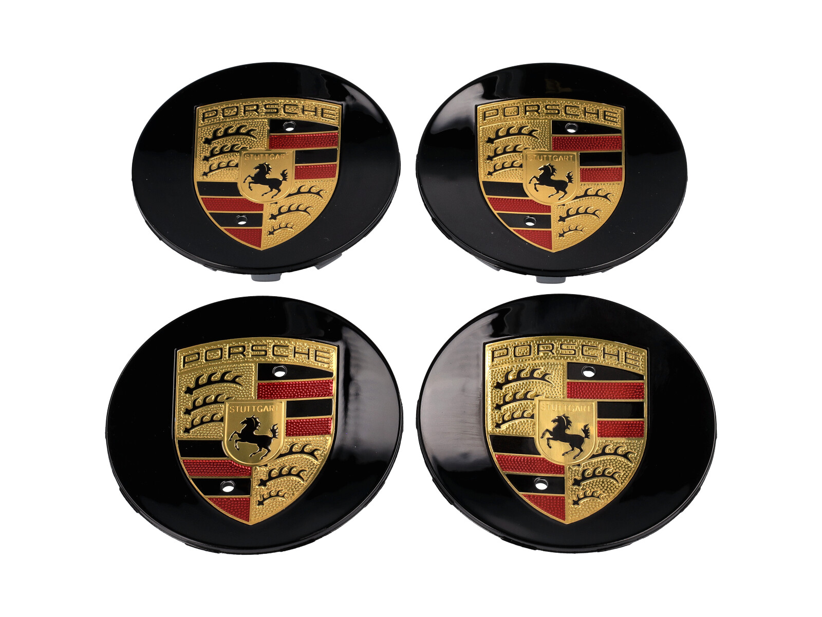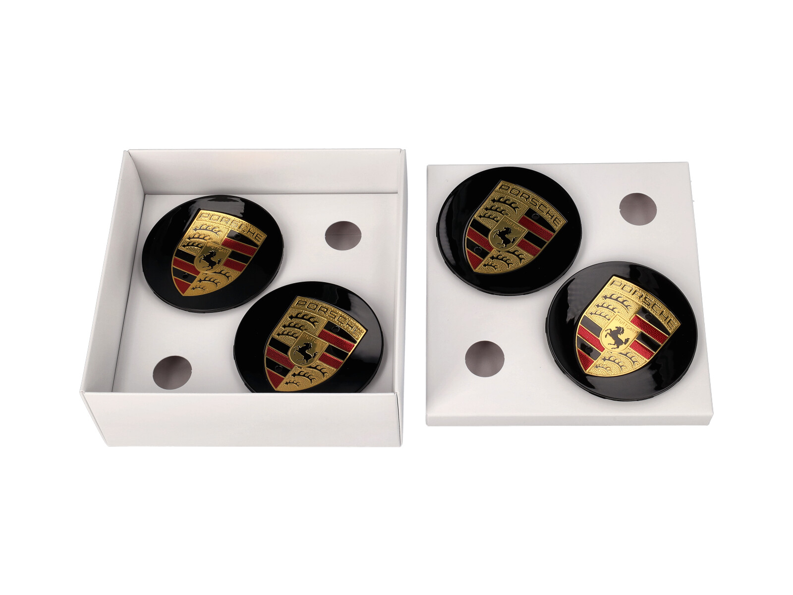 Set of 4 painted in Black (high-gloss) with coloured Porsche Crest.