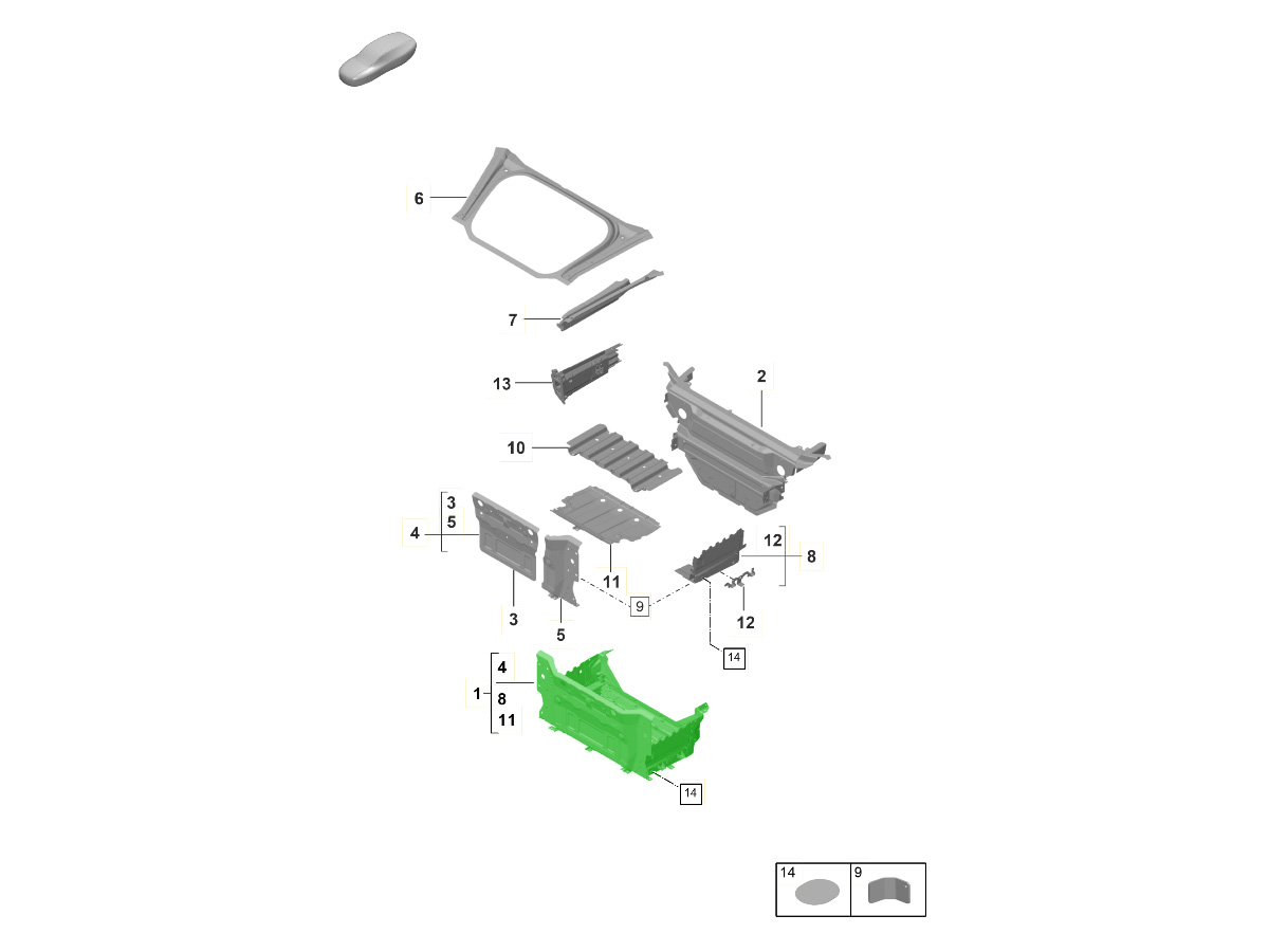 •在车辆上的位置:安装在前行李舱(前备箱)或行李箱地板上,作为地板下方或上方的内盒/托盘,与车辆的车身结构支架点对齐。