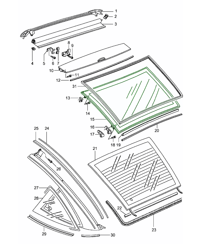 这是保时捷 993 Targa 的原装保时捷滑动玻璃车顶面板。该面板专为 1994 至 1998 年款车型设计,是恢复 Targa 车顶系统功能和外观的必备替换部件。