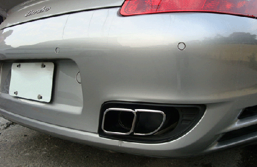 DesignTek Twin Square Design tail pipes, bolt-on exhaust tips for stock OEM Porsche 997TT mufflers. These tips should also fit virtually any aftermarket 997TT exhaust designed that allows reinstallation of factory tips.