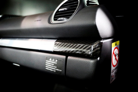 碳纤维内饰套件:PDK 换档器和仪表板装饰条。PDK 换档器采用黑色真皮覆盖。