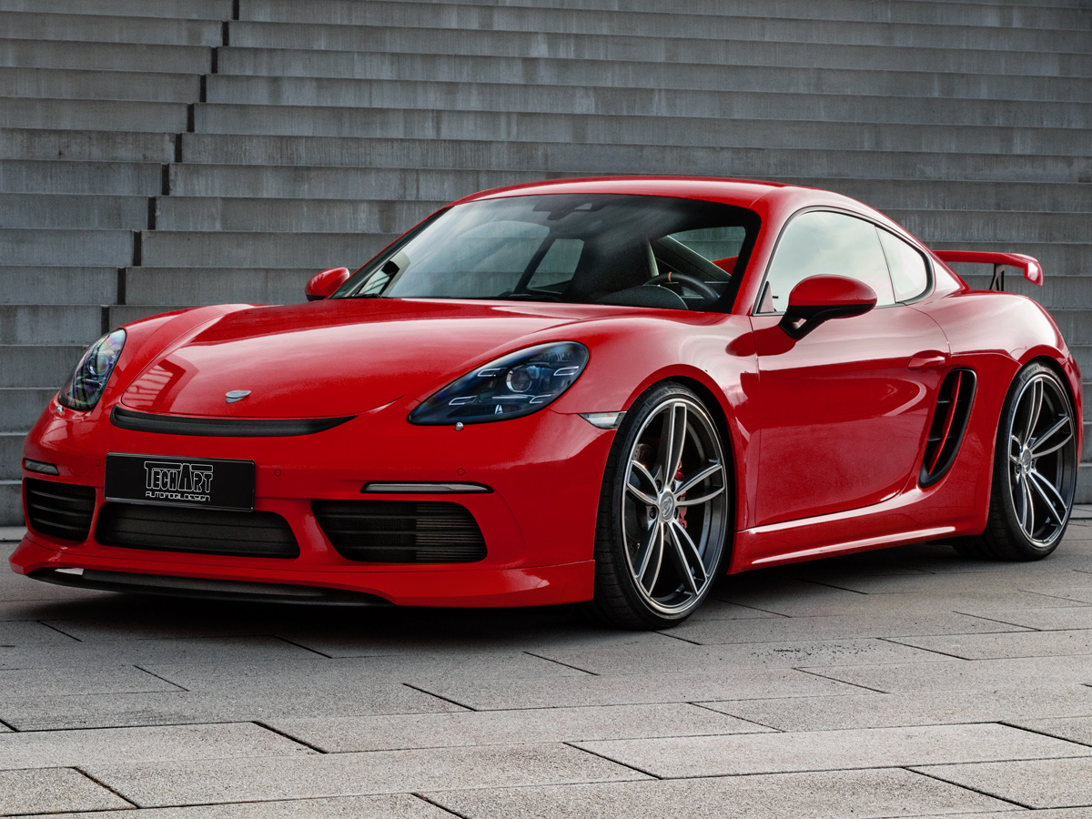 TechArt 前扰流板 I,带有集成分流器的两件式前扰流板在视觉上延伸了 718 的前视野并降低了空气动力升力。