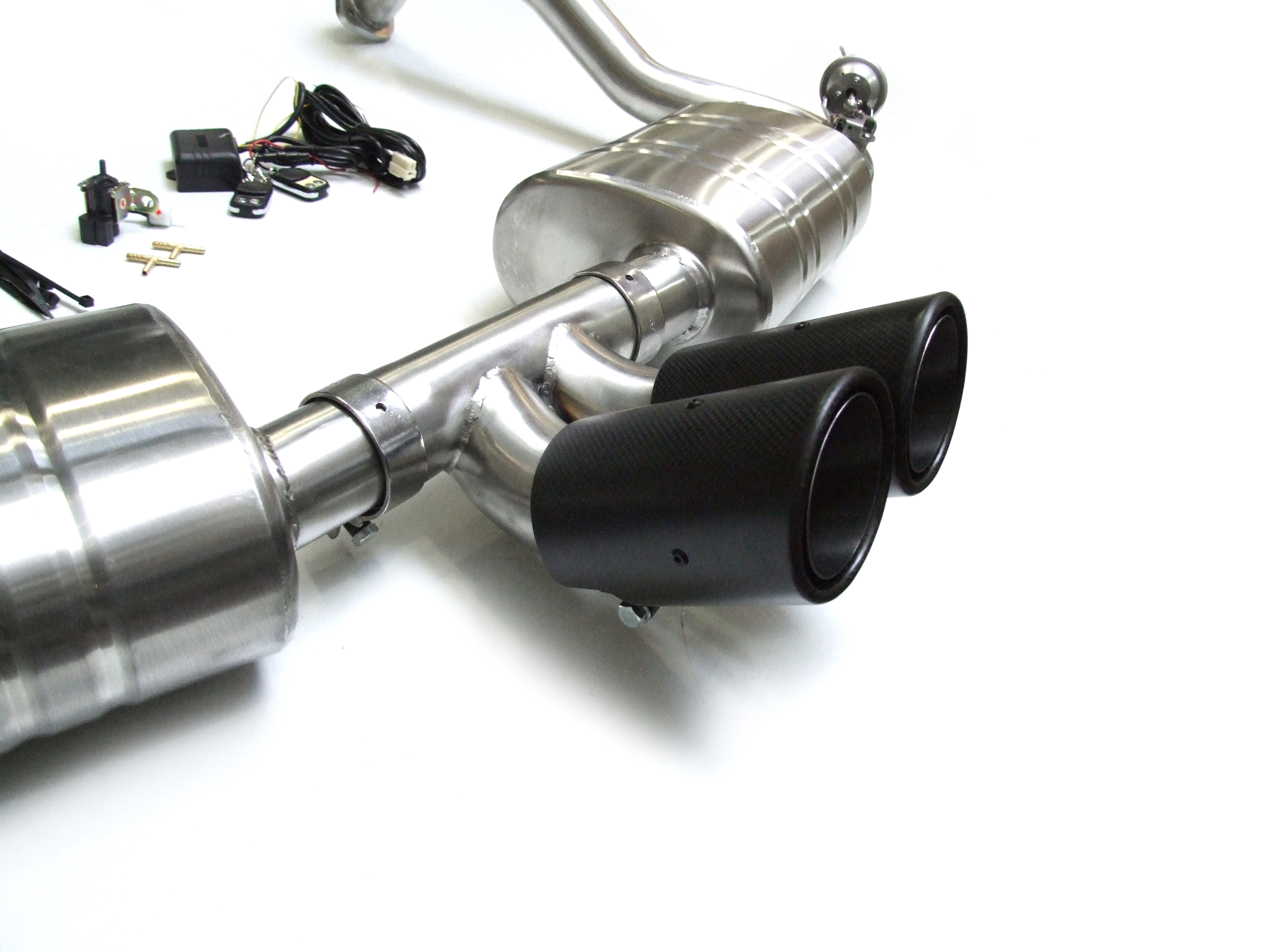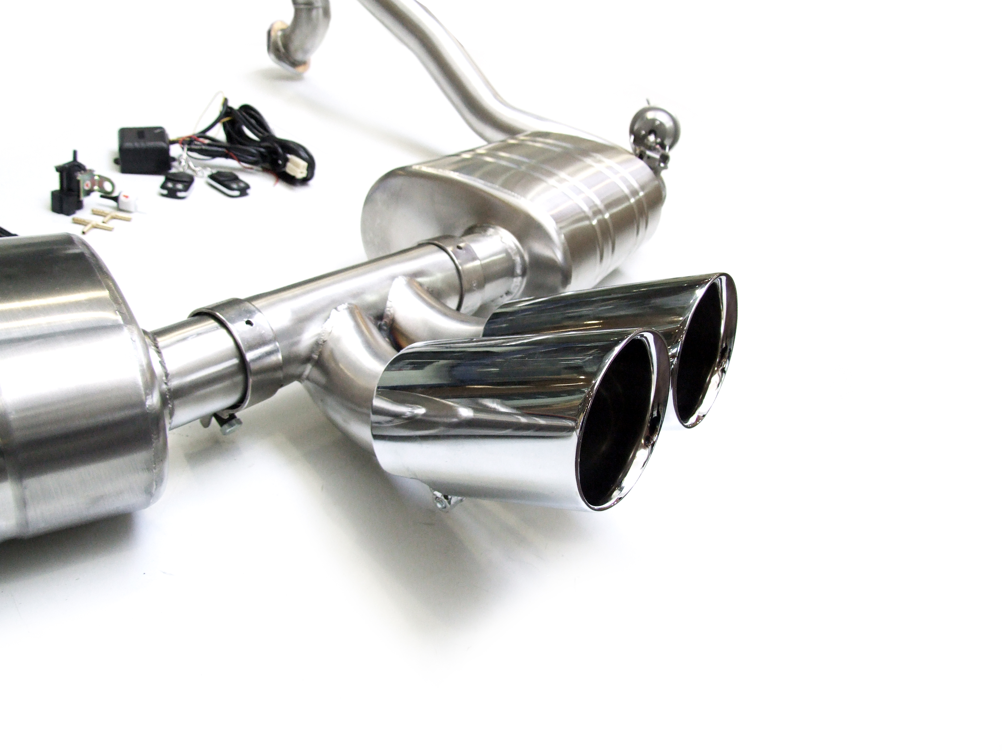 DesignTek Valvetronic sports exhaust system gives smooth 12Bhp/15 ft-lbs of torque to the wheels with the valves opened, +8HP/10 ft-lbs of torque to the wheels with the valves closed. Made from high quality 14-16 gauge T304 stainless steel, hydro-formed muffler cases, radiuses stressed relieved with 2000 degree ceramic fiber and stainless steel wool packed free flow mufflers.