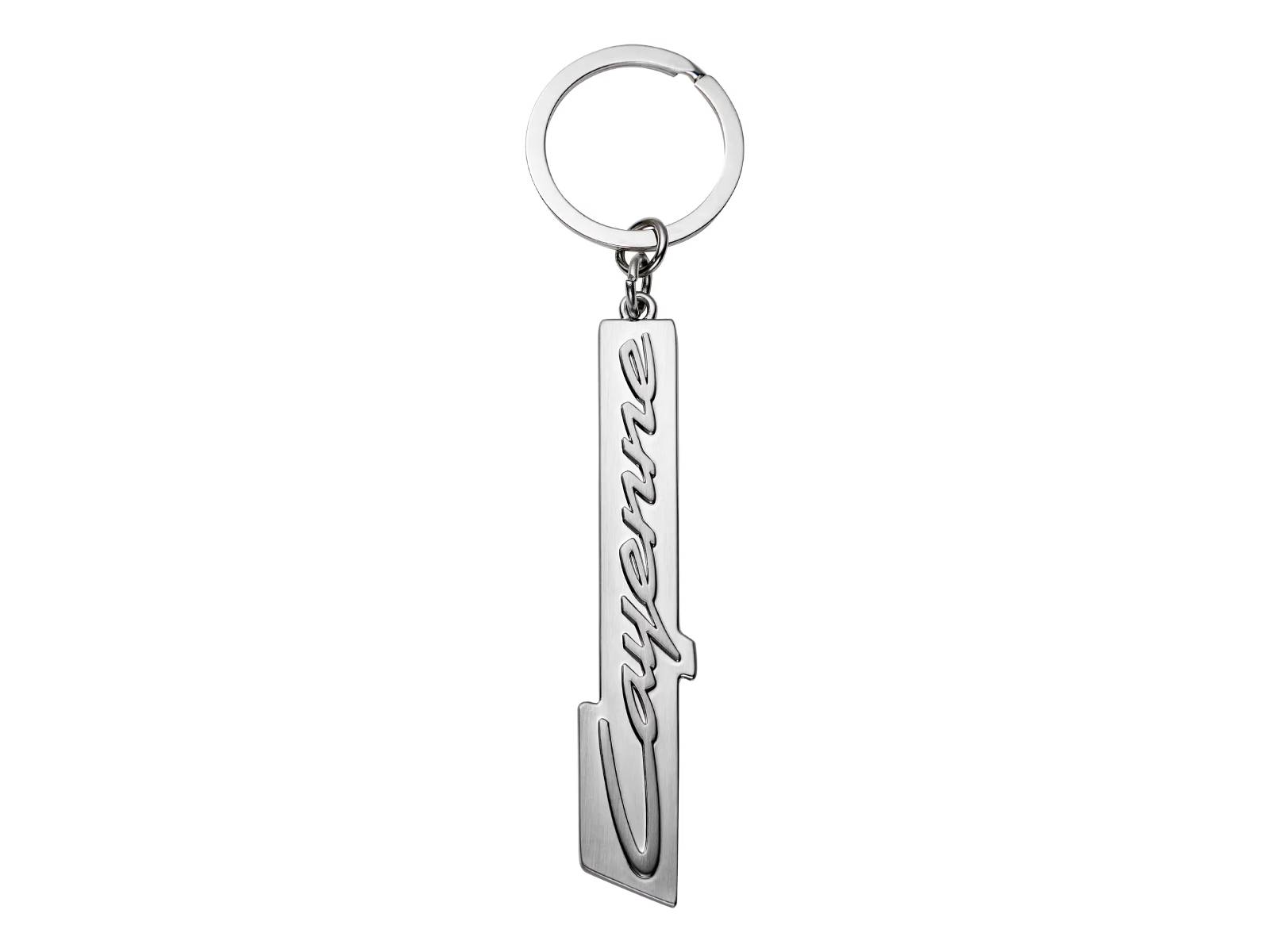 将属于同一件物品固定在一起:带有保时捷卡宴车型刻字的纯粹钥匙圈。