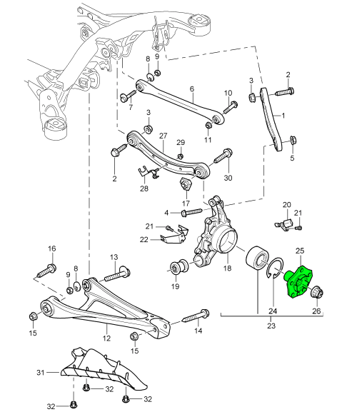 轮毂和轮架是保时捷悬架和车轴系统的重要组成部分。它们共同构成车轮、制动盘和轴承组件的中心安装点,确保车辆平稳旋转并精确校准。轮架(或转向节)连接到悬架臂和转向系统,保持精确的几何形状,从而确保车辆的稳定性、安全性和操控性。