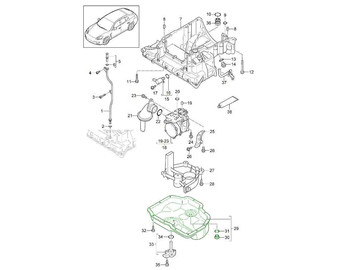 发动机油底壳,也称为油底壳,是保时捷润滑系统的重要组成部分。它是储存、收集和循环发动机机油的主要容器。油底壳确保机油持续供应到所有关键运动部件,从而保持冷却、润滑和发动机寿命,尤其是在高性能驾驶期间。