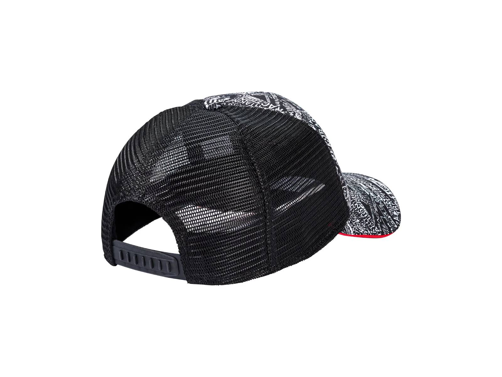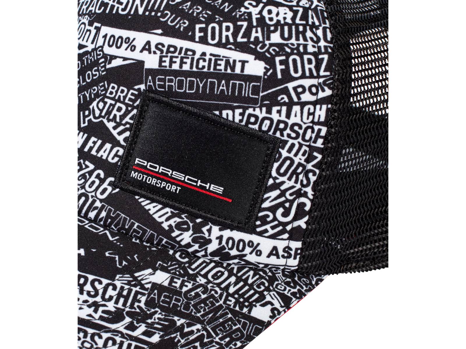 保时捷中性帽 - Motorsport Fanwear,黑色/白色。 Motorsport Fanwear 系列集赛车精神、时尚设计和卓越品质于一身。这款五片式棒球帽采用 100% 再生聚酯纤维制成,整体印花灵感源自 911 GT3 R (992) 的迷彩车身,并饰有保时捷的励志格言。网状后部提供清爽透气的体验,确保所有赛车爱好者保持头脑清醒。带有保时捷压花的帽扣和正面缝制的保时捷 Motorsport 小标签,彰显了这款棒球帽的独特设计。