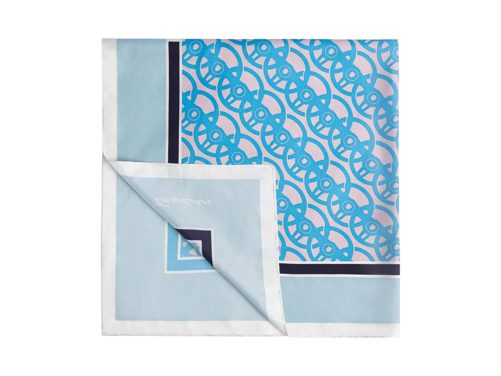 保时捷丝巾,蓝色。优雅的丝巾,印有鲜艳色彩的高品质印花,以及专属的保时捷和 Taycan 标志。一排排方向盘构成了一种图案,让人一眼就能看出方向盘的真面目。