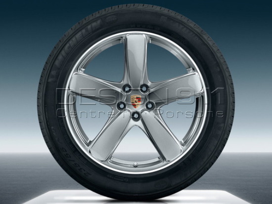 Original Porsche 19-inch Macan Sport Classic summer wheel-and-tyre set. Painted in GT Silver Metallic with bright-polished surrounding rim. One-piece forged alloy wheel in 5-spoke Sport Classic design. For vehicles with Tyre Pressure Monitoring.Wheel dimensions (offset (ET) in mm):