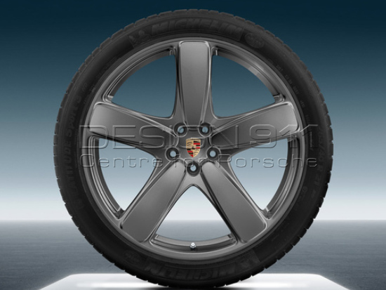 Original Porsche 21-inch Macan Sport Classic summer wheel-and-tyre set. One-piece forged alloy wheel in 5-spoke Sport Classic design. Painted in GT Silver Metallic with bright-polished surrounding rim.For vehicles with Tyre Pressure Monitoring.Wheel dimensions (offset (ET) in mm):
