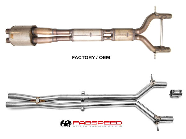 Fabspeed 排气谐振器旁路 X-Pipe。自由流动的 X-Pipe 取代了工厂的中管和共振器,以改善排气流量、增加功率并增强排气音。
