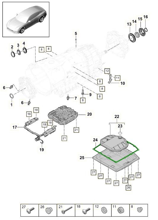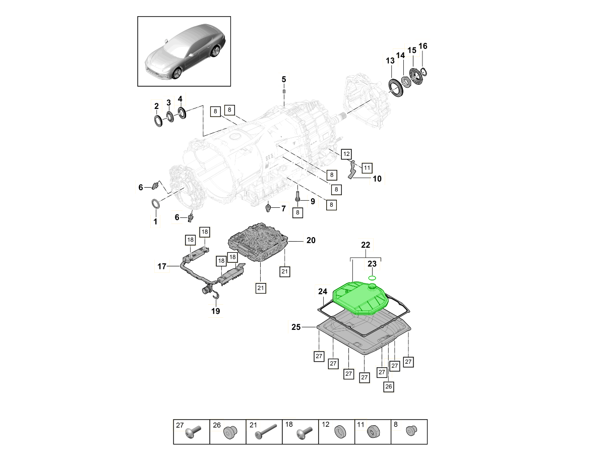 变速箱油底壳或油底壳在您的保时捷变速箱系统中起着至关重要的作用。它充当变速箱油的储存器,确保内部组件的正常润滑、冷却和液压运行。高品质的油底壳可以保持变速箱油的密封、过滤并免受污染——这对于保持平稳的换挡和整体传动系统性能至关重要。
