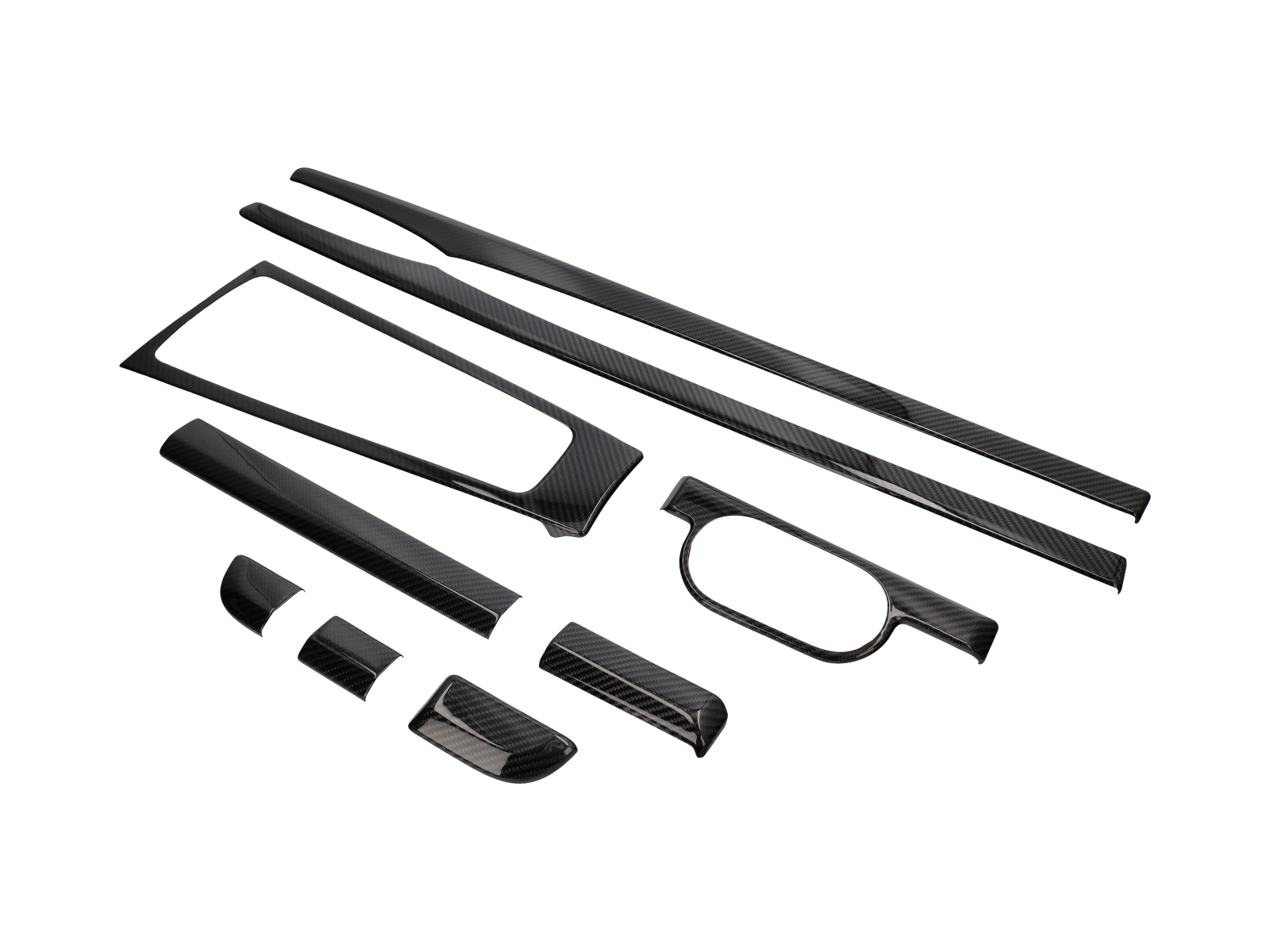 碳纤维内饰套件。碳纤维饰面:变速杆或 PDK 选档杆和仪表板装饰条。变速杆或 PDK 选档杆采用黑色皮革饰面。