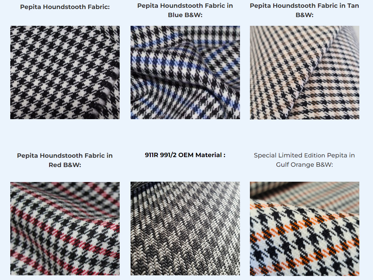从 OEM 911R 及以后的工厂黑色/银色或玛瑙灰色材料(非复制品)或我们的 Pepita 千鸟格面料系列中进行选择。