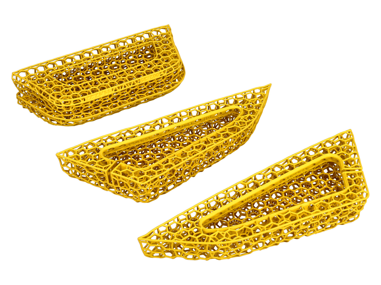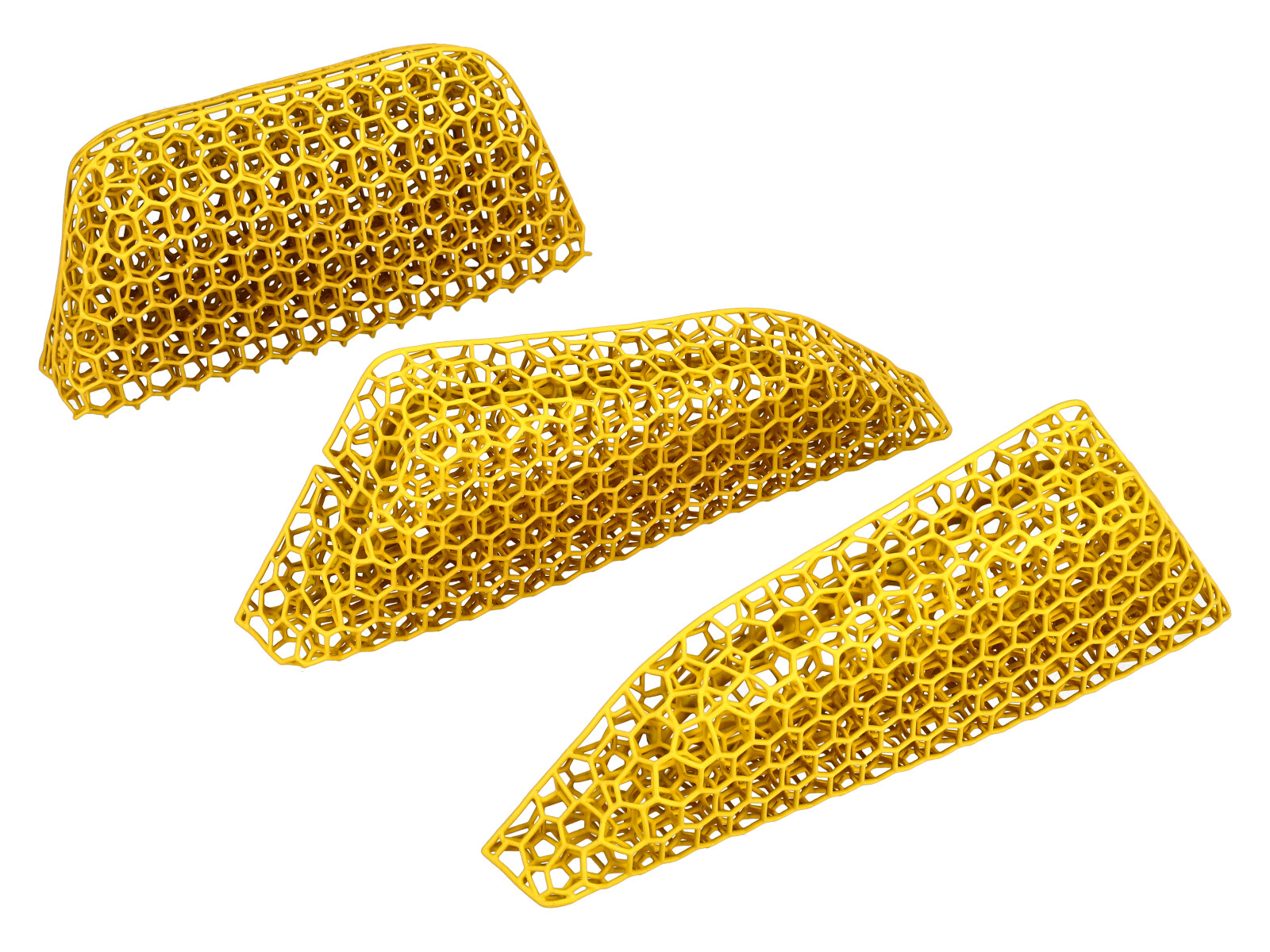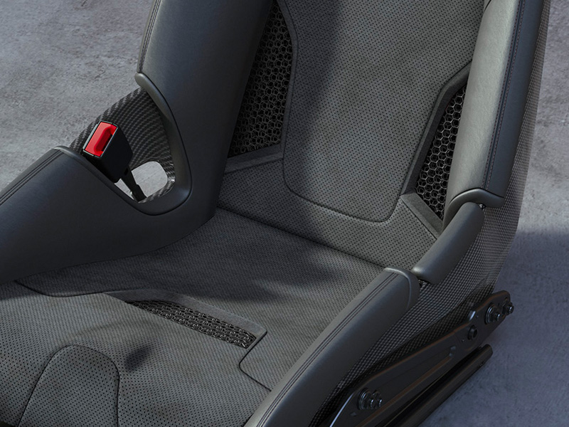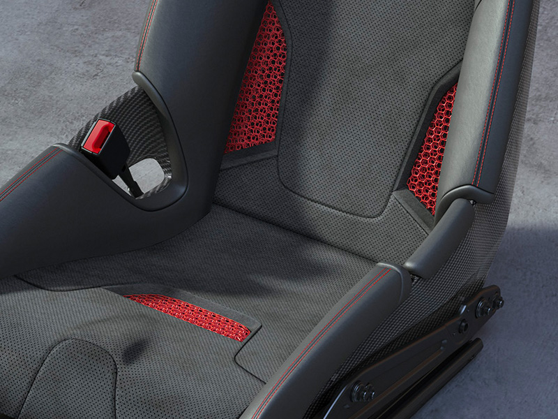 The 3D printed bodyform full-bucket seat combines maximum functionality with individual design. The seat cushion and the seat backrest of the full-bucket seat already installed in the vehicle are replaced by new elements. These consist of a solid and energy-absorbing substrate material, a 3D-printed elastic grille structure and a perforated top covering made of Race-Tex. The grille structure and perforation improve both the passive air conditioning and the resilience of the seat. At the same time, depending on the selected degree of hardness, the upholstery has a weight advantage of more than 8% compared to the standard material. A deep seat position typical of motor sports and increased lateral support thanks to a thigh cushion provide an even more direct feel for the track - for an experience similar to that in motor racing.