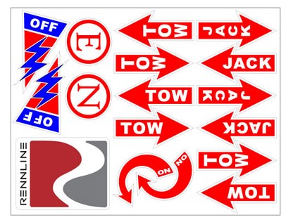 Rennline 34 件套乙烯基贴花套装符合许多赛事管理机构强制执行的赛事规则要求。该套装包含: